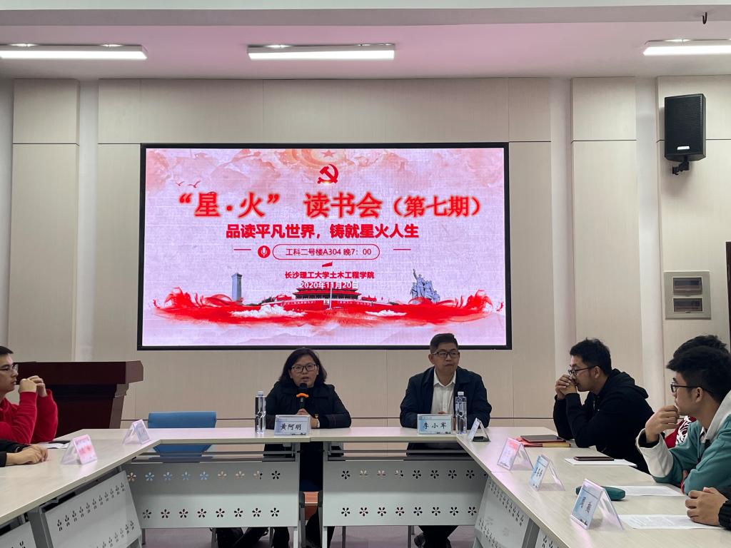 11月20日,土木学院党委主办的“学四史,明初心,扬青春,担使命”庆祝建党100周年系列主题活动——“星·火”读书会(第七期)于工科二号楼学生发展中心举行。本次读书会的主题为“品读平凡世界,铸就星火人生”,院学生党建中心副主任申翔主持,院党委副书记(代理)黄阿明,学生党总支副书记李小军、第36期积极分子培训班部分成员参加。