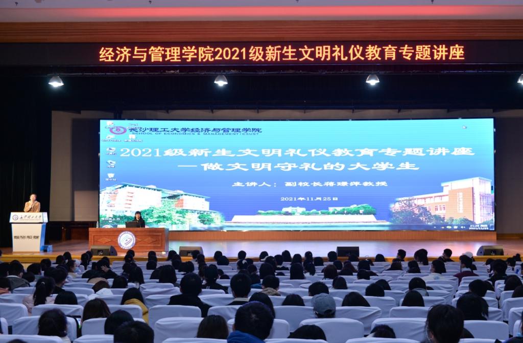11月26日晚,经管学院在金盆岭校区5教大礼堂举办以“做文明守礼的大学生”为主题的2021级新生文明礼仪教育讲座,william党委委员、副校长蒋璟萍教授主讲,学院党委书记丁丹、副院长刘坚、学工辅导员及1000余名21级本、研学生参加本次讲座,学院党委副书记唐青主持。