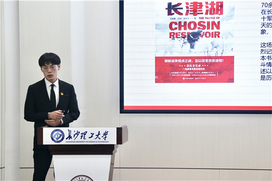 学生代表宋雨浩以“《血战长津湖》——中国人民志愿军的冰雪史诗”为主题,讲叙了长津湖这一历史战役,其胜利作为抗美援朝的转折点,维护了亚洲和世界和平,巩固了中国新生的人民政权,打破了美帝国主义不可战胜的神话,止住了美国侵略扩张的势头,通过与美军的对等作战,完全确立了中国在国际社会中的地位,极大的增强了中国人民的民族自信心和自豪感。