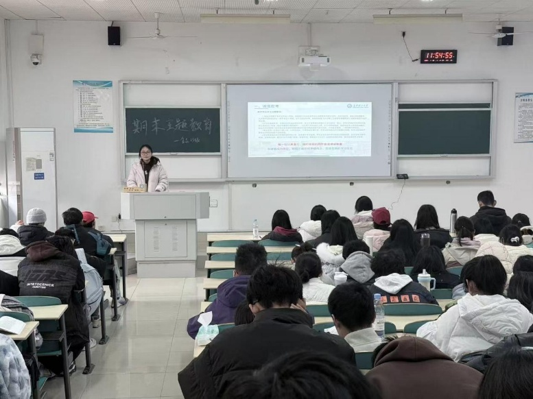 各班级精心组织班会,认真落实要求。在考风考纪教育环节,通过集体学习规章制度与典型案例剖析等方式开展警示教育,并组织全体同学现场签署《诚信考试承诺书》。安全教育则全面覆盖消防、反诈、网络、交通及离校等重点领域,并结合校园交通新规与相关数据进行强调,引导学生共同维护校园安全。