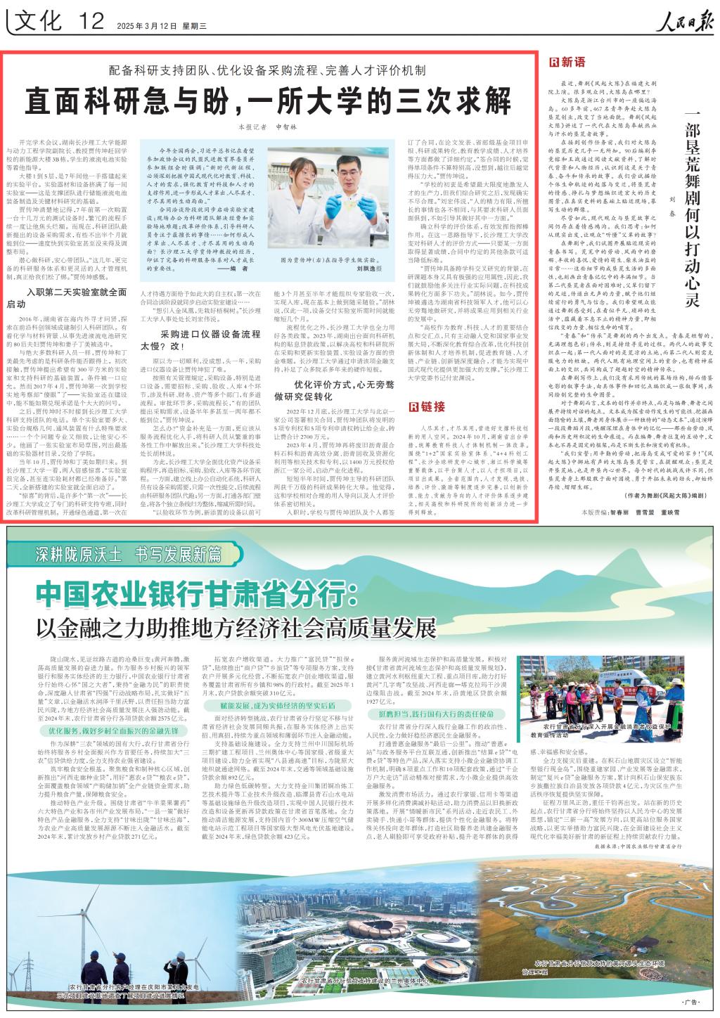 3月12日,《人民日报》刊发文章《直面科研急与盼,一所大学的三次求解》,聚焦报道学校配备科研支持团队、优化设备采购流程、完善人才评价机制,以完备的科研服务体系助推人才成长发展。