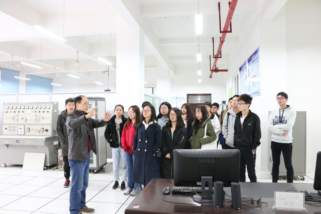 学生在实验室听老师讲解电气工程相关知识。