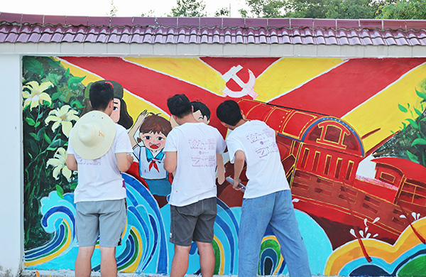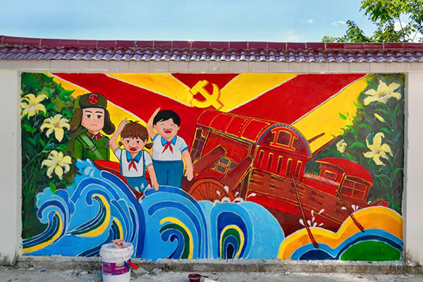 顺应从“脱贫攻坚”到“乡村振兴”的转变,结合当地民族特色,在200余平方米的墙体上进行彩绘。除了标语,他们还绘出具有当地民族特色的人物舞蹈画。打底稿,调色,补色,描边……冒着炎炎烈日,团队志愿者们在白色的墙体上认真绘制,一画就是几个小时。通过志愿者们了解到,这次绘画的内容较多,面积大、时间紧,所以团队都很少休息。为了尊重当地民族的传统,志愿者团队听取了驻村干部的意见,并提前上网查阅资料,确保绘制的内容符合当地民族文化。
