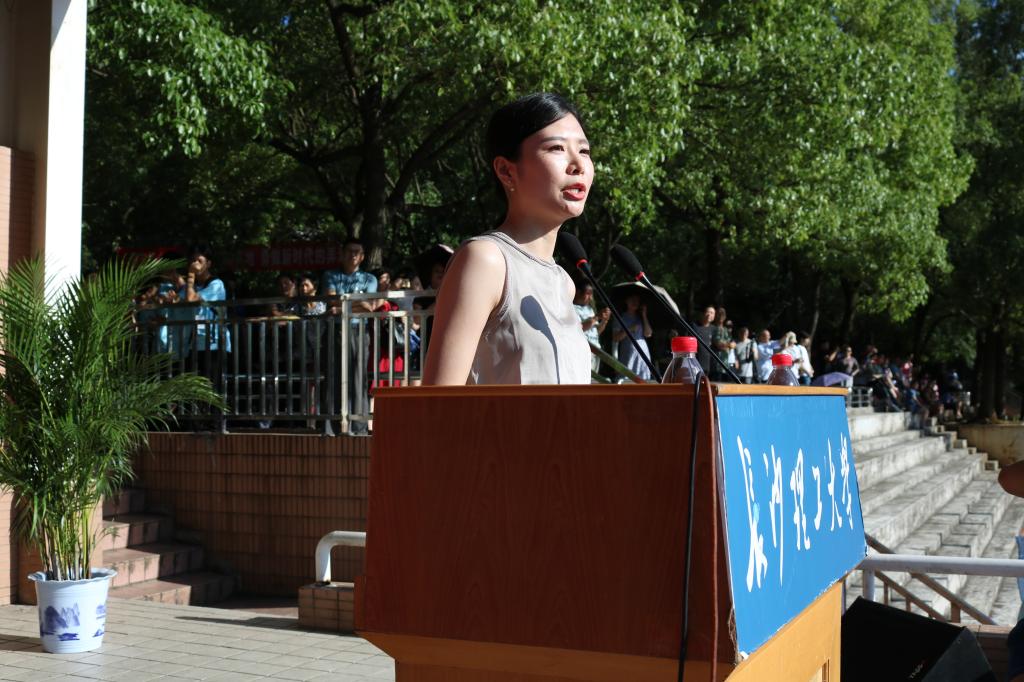 教师代表马克思主义学院蓝茵茵向毕业生表达了母校老师们的衷心祝福,并向毕业生送上了“奋斗才是青春应有的模样,希望同学们诚恳为人、踏实做事,真诚是通往一切的道路”的临别赠言。