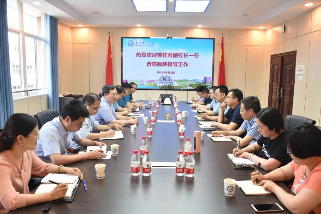 6月8日下午,副校长曾祥君带领科研部部长王进、社科处处长刘建江、成果转化中心副主任刘亚辉及科研部副部长胡宏伟、姚宇、王媛媛等领导一行来我院走访调研,学院党委书记成华、院长陈荐及教师代表参加座谈调研。