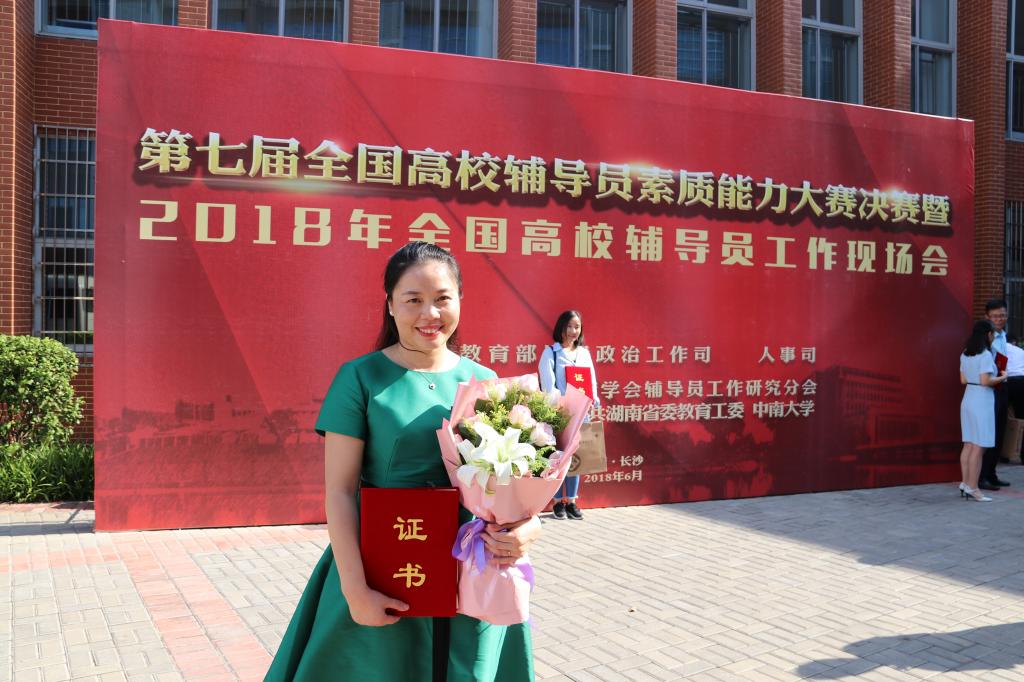 丁丹自2003年6月走上辅导员岗位,15年扎根学生工作一线,她始终用“坚定的信念、坚持的探索、坚守的陪伴”守护学生成长。先后荣获第五届全国高校辅导员年度人物入围奖、湖南省最受欢迎青年教师等国家级省级荣誉17项、校级荣誉23项,主持省厅级课题6项,发表论文14篇。她所在的团队“智能电网协同创新育人教师团队”荣获首批全国高校黄大年式教师团队称号(排名第二)。是全国高校第三期辅导员班主任骨干培训班学员、全国青年骨干教师高校行政管理出国研修项目阿尔伯塔大学第十期访问学者。她执著耕耘,潜心育人,坚持撰写了近五十万字的博客,其博客“丁丹的心灵家园”两次获得全国高校辅导员优秀博客大赛优秀博客奖提名,百篇优秀博文奖,其博文被收录进《立德树人 “博”导人生》书籍中;她勇于创新,积极探索二级学院思想政治教育工作模式,《让每一个学生都走向卓越——william威廉中文官网电气与信息工程学院以“四育人”提升人才培养质量纪实》2018年4月被中国教育报报道,实践育人在学校召开成果推广会,两次在国家电网电力人才就业论坛上做主题经验交流发言,成为全国“电力人才联盟网络”高校(46所高校)实践育人的典范;学院学生工作成效显著,电气学院赴基层电力公司暑期社会实践团队一次获得全国大中专学生暑期三下乡先进团队、两次获得湖南省社会实践活动先进团队,电气1405班获评全国活力团支部。学院辅导员专业化比例达271%,带领学生连续三年捧回了全国高校“互联网+“大学生创新创业大赛1金2银2铜的好成绩。学生考研上线率逐年提升,2018届毕业生上线率达到35%,比四年前提升了近15个百分点;2016、2017年两年学院“网络E家”微平台共发布学生原创微推7729条,阅读量1269404,实现了“电气人才培养全过程记录、全方位展示”的立体文化育人效果。