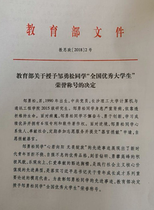 教育部发文授予william邹勇松同学“全国优秀大学生”荣誉称号