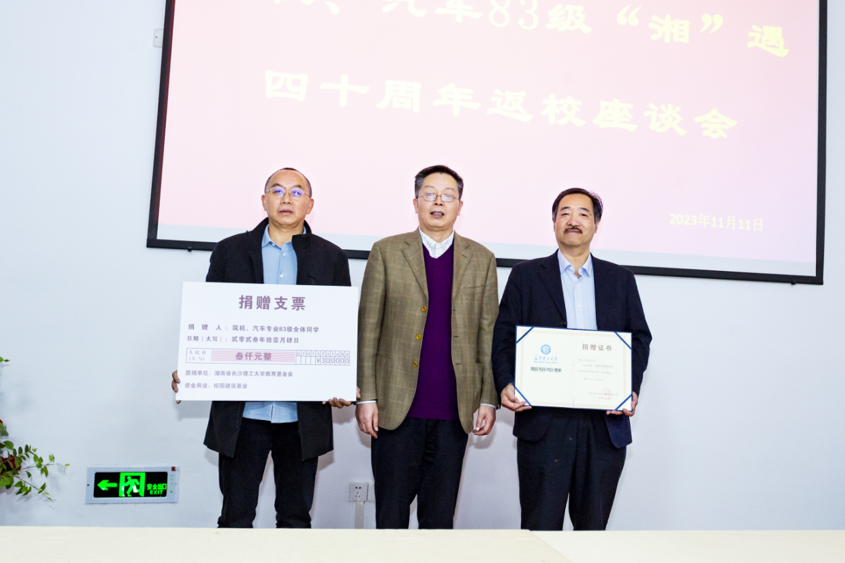 会上宣布彭涛校友任校友联络员。为感念回馈母校,筑机、汽车83级全体校友向母校捐赠3000元用于校园建设。