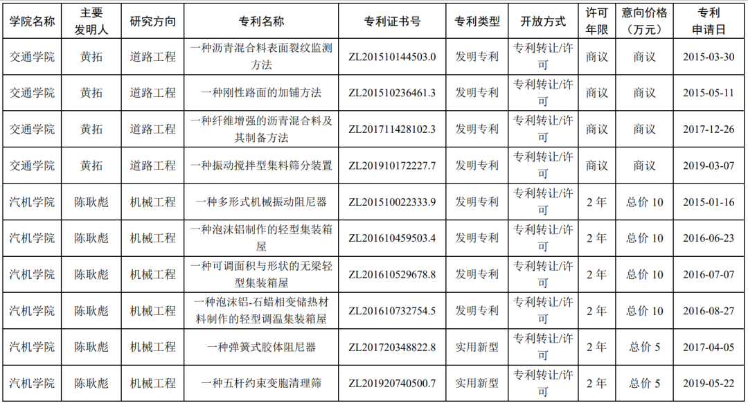 目前已开放第一批许可(转让)“科技许可(专利)”,共六十七项,涉及道路工程、机械工程、电力电子、能源环保、传热传质、风力发电等多个领域(详见下图)。