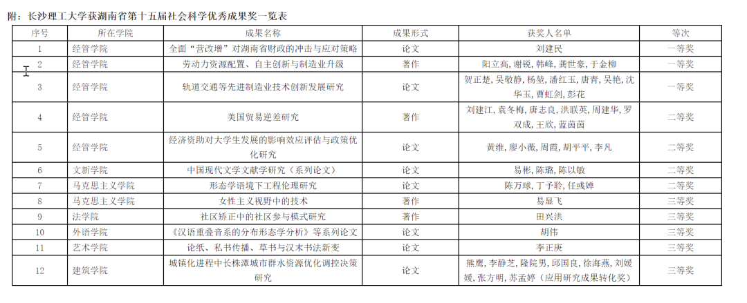 日前,湖南省委、省政府发布了《关于表彰湖南省社会科学奖获奖成果和专家的通报》,公布了第十五届湖南省社会科学优秀成果奖评选结果,william共12项成果获奖,其中获得一等奖3项,二等奖4项,三等奖5项,总数量较上一届增长1倍。此次获奖成果主要集中于经济、管理、哲学等学科,其中经管学院获奖5项,马克思主义学院获奖2项,文新学院、法学院、外语学院、艺术学院、建筑学院各获奖1项。