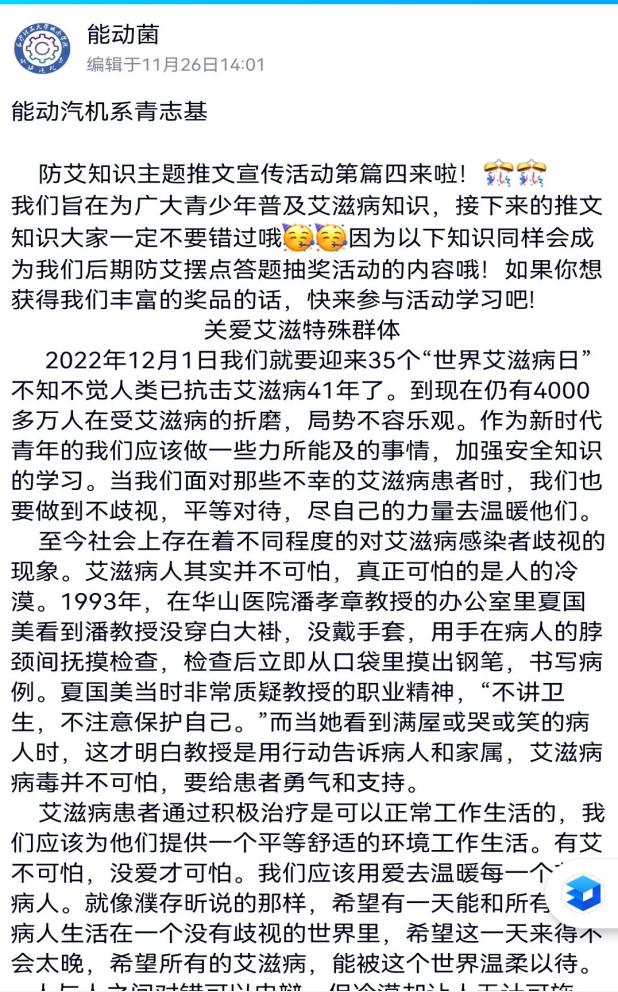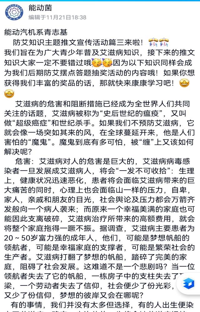 城南学院青年志愿者基地开展线上防艾知识推文。同学们将防艾主题的知识推文通过能动汽机系的官方QQ发送,包括如下一些内容:(1)艾滋病的定义和起源(2)艾滋病的传播途径和预防措施(3)艾滋病的危害和阻断措施(4)关爱艾滋病病人。这四篇知识推文都是社团骨干自己搜集,整理,由雷鹂老师审核指导再发布的。同学们在这个过程中更深刻了解了艾滋病的知识,起到了引领和自我教育的作用。