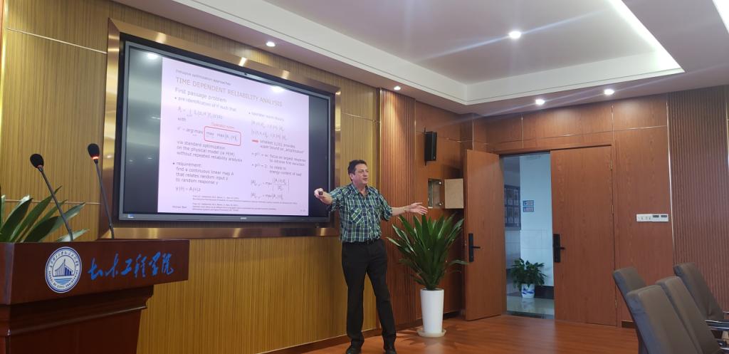 2023年10月1日上午,土木工程学院研究生博力学术论坛之大师引领系列讲座继续在云塘校区工科二号楼A304学术报告中心举行。德国汉诺威莱布尼茨大学(Leibniz Universität Hannover)风险与可靠性研究所所长Michael Beer教授受邀为师生们做了题为“Efficient reliability analysis with imprecise probabilities”的学术报告。报告会由土木工程学院张振浩教授主持,彭建新教授、夏桂云教授等教师以及40余位研究生参加了本次学术交流。