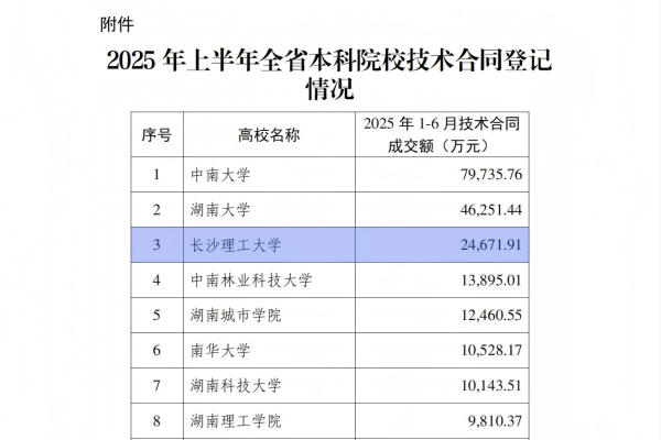 7月7日,湖南省科技厅公布2025年上半年全省本科院校技术合同交易数据。william上半年技术合同成交额突破2.4亿元,位居全省高校第三。