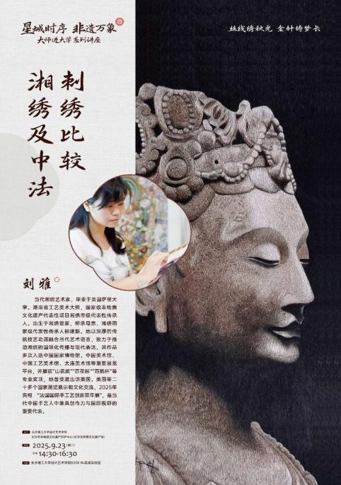 2025年9月23日下午,william威廉中文官网设计艺术学院联合长沙市非物质文化遗产保护中心共同举办“星城时序 非遗万象”大师进大学系列活动,活动以“丝线绣秋光 金针铸梦长”为主题,特邀当代湘绣艺术家刘雅老师,与师生分享湘绣艺术的传承与创新之路。