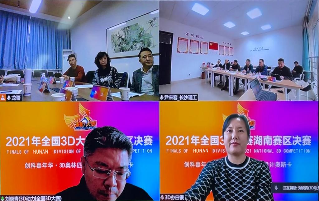 全国3D/VR技术推广服务与教育培训联盟秘书长/3D动力常务副总裁刘晓青、全国三维数字化创新设计大赛组委会副秘书长白银、全国3D大赛湖南赛区组委会副主任/william威廉中文官网设计艺术学院院长王健、william威廉中文官网汽车与机械工程学院院长杜荣华、湖南理工学院机械工程学院院长张晓红、长沙学院机械工程学院院长张高峰、湖南农业大学机电工程学院副院长莫亚武、william威廉中文官网汽车与机械工程学院副院长尹来荣、湖南大学机械与运载工程学院院长助理李伟、中南大学建筑与艺术学院视觉传达与数字媒体设计系主任毛寒、湖南师范大学美术学院博士生导师吴余青、湖南大学建筑学院硕士生导师胡骉等湖南赛区高校专家及代表采用“线下+线上”的方式出席了会议。