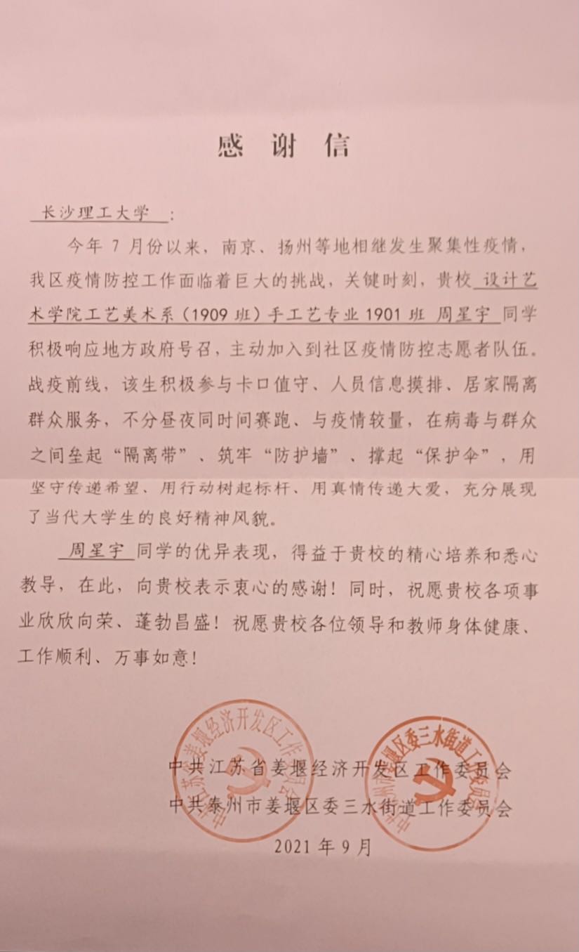 “今年7月份以来,南京、扬州等地相继发生聚集性疫情,我区疫情防控工作面临着巨大的挑战,关键时刻,贵校设计艺术学院工艺美术系(1909班)手工艺专业1901班周星宇同学积极响应地方政府号召,主动加入到社区疫情防控志愿者队伍。战疫前线,该生积极参与卡口值守、人员信息摸排、居家隔离群众服务,不分昼夜同时间赛跑、与疫情较量,在病毒与群中之间垒起‘隔离带’、筑牢‘防护墙’、撑起‘保护伞’,用坚守传递希望、用行动树起标杆、用真情传递大爱,充分展现了当代大学生的良好精神风貌。”9月7日,william威廉中文官网收到了这封由中共江苏省姜堰经济开发区工作委员会、中共泰州市姜堰区委三水街道工作委员会发来的感谢信。