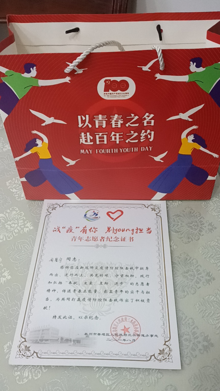 在疫情防控服务过程中,周星宇同学主要是在姜堰区马厂、锦姜社区和三水街道进行志愿服务,她主要负责协助社区进行居民信息采集以及上门服务,帮助家庭老人注册激活“国家医疗保险电子凭证”等。谈起这个暑假报名参加社区志愿服务活动以及回想起整个过程中的点点滴滴,周同学感触颇深,她说:“作为一名当代大学生,我通过志愿服务为疫情防控贡献了自己一份微薄之力,其实没想那么多,想为家乡疫情防控尽点心,自己便冲上去了。这次疫情复发江苏省这边是比较严重的,南京市和扬州市最为严重,而泰州是离这两个市最近的,如果泰州也出问题,蔓延就更不可控。我喜欢参加各种各样的志愿者活动,想尽自己的一份力为社会多做一些贡献。疫情没有那么慈眉善目,社区工作也充满着起伏与坎坷,但这些都是征战疫情必须要经历的,当我们打赢这场‘战争’时,之前经历过的所有委屈、焦虑和恐慌在人们的笑容与欢乐中消失无踪,我爱我的家乡,我爱我的祖国,面对美好,人人有梦。”