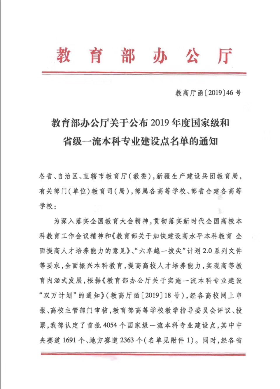 一流本科专业建设是教育部全面贯彻落实全国教育大会和新时代全国高校本科教育工作会议精神,推动新工科、新医科、新农科、新文科建设,做强一流本科、建设一流专业、培养一流人才,全面振兴本科教育,提高高校人才培养能力,实现高等教育内涵式发展的重要举措。本次国家级一流本科专业建设点的获批,是对我院专业建设及人才培养取得成绩的充分肯定。