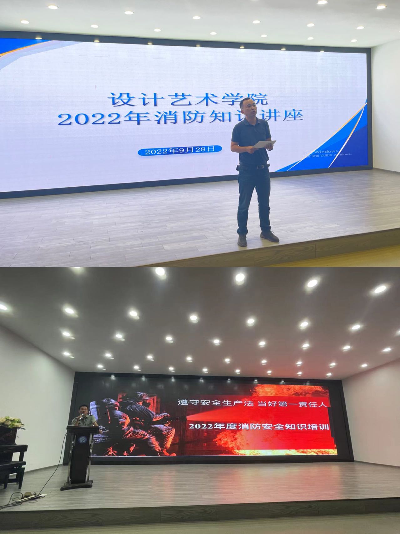为深入贯彻落实省教育厅《关于进一步做好全省教育系统消防安全工作的紧急通知》精神,根据学校2022年度安全稳定工作会议的要求。9月28日下午,设计艺术学院邀请湖南省普消消防安全服务中心的专业宣传教官为师生开展消防安全讲座及演练,学院领导班子、行政人员、实验人员、教师代表以及各班级学生代表200余人参加了本次培训和演练。