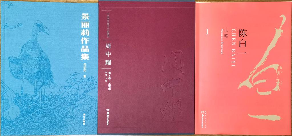 李天玉老师此次捐赠的《李天玉花鸟画集》收录了历年画作80余幅,酣畅淋漓的泼墨写意与工细华美的点彩相融,令人耳目一新。周中耀老师此次捐赠的《中国当代美术大家系列·周中耀》一套共四册,收录了含工笔、写意、白描写生在内的历年画作千余幅,笔法遒劲、意度天成。景丽莉老师此次捐赠的《景丽莉作品集》收录历年画作100余幅以及早年写生与习作,精细华美,境界高雅。陈丽芳老师此次捐赠的《陈白一》共五卷,包含工笔、白描、写意与素材在内的历年画作近千余幅,朴实无华处刚柔并济,圆润流畅处潇洒自如。