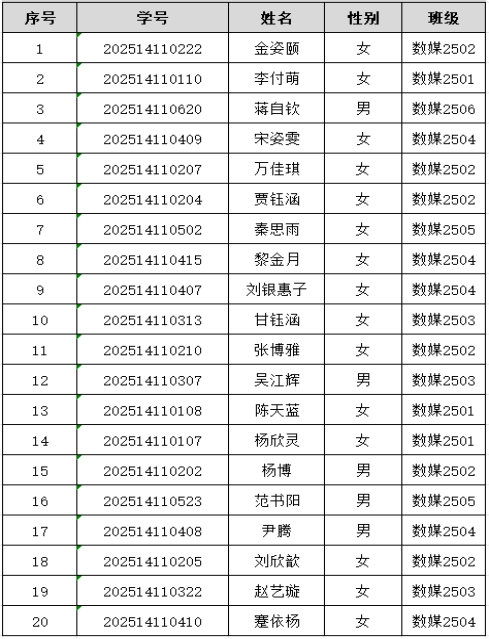 根据《设计艺术学院2025级数字媒体艺术专业创新班选拔工作方案》,经学生自愿申请,我院于1月6日下午在艺术楼C317组织开展数字媒体艺术专业(创新班)选拔面试工作。现将2025级数字媒体艺术专业(创新班)学生录取名单进行公示(详见附表),公示期2026年1月8日-2026年1月11日,如有异议,请于公示期内以实名和书面形式向学院教务办反映。(地点:艺术楼C308,联系人:鲁老师,电话:85258772)