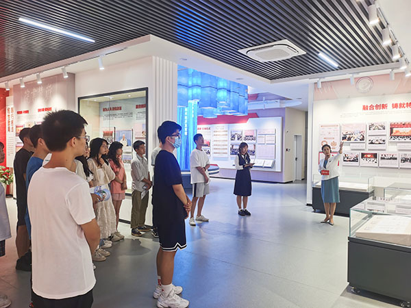 在教育基地讲解员的引导下,同学们由外厅进入,首先映入眼帘的是印有学校变迁历程的浮雕,观看了基地宣传片《立德树人 逐梦报国》。一起重温了william几十年来不断发展壮大的风雨历程,深切感受到了william厚重的文化底蕴和发展潜力。教育基地以“立德树人 逐梦报国”为主题,集中展示了党领导高等教育发展的历史进程和学校的三全育人成效,打造育人新阵地。基地展览面积有1900多平方米,展陈方式丰富多样。主要分为“国之大者”、“材之茂者”、“师之贤者”、“行之实者”四个篇章,运用照片、景窗模型等实物来展现学校的发展历程和光辉历史,呈现了学校与时代同进步、与人民同奋进的历史进程。
