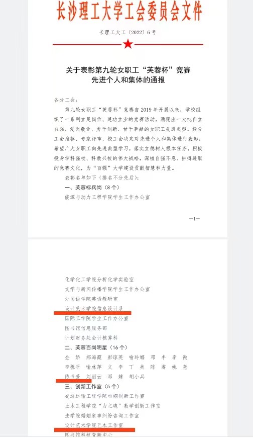 陈书芳老师获评“芙蓉百岗明星”,学院信息设计系荣获“芙蓉标兵岗”,学院己木工作室被评为“创新工作室”。
