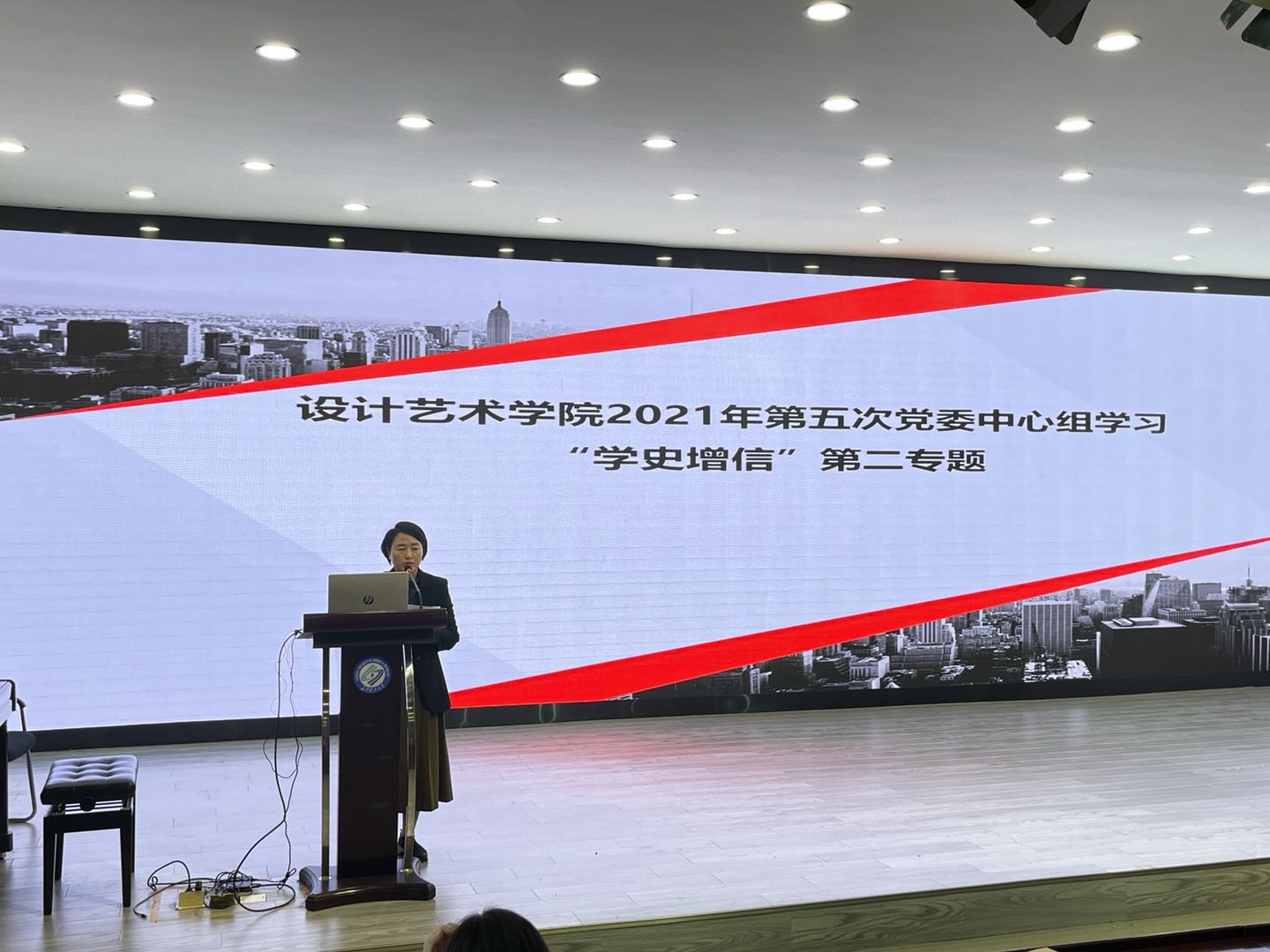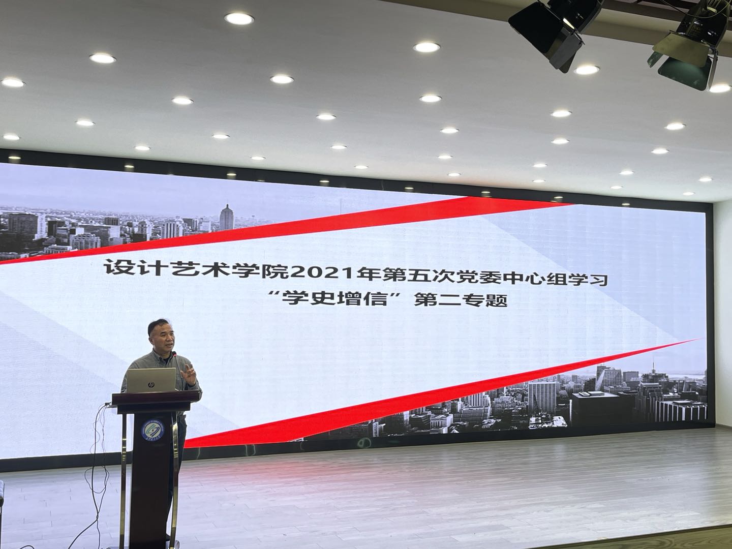 4月27日下午,设计艺术学院在艺术楼报告厅召开2021年第五次党委中心组学习(扩大),深入学习党史学习教育“学史增信”第二专题。党委书记江河主持会议,学院党政班子成员、行政办公室主任、党支部书记和系部(中心)主任参加学习。
