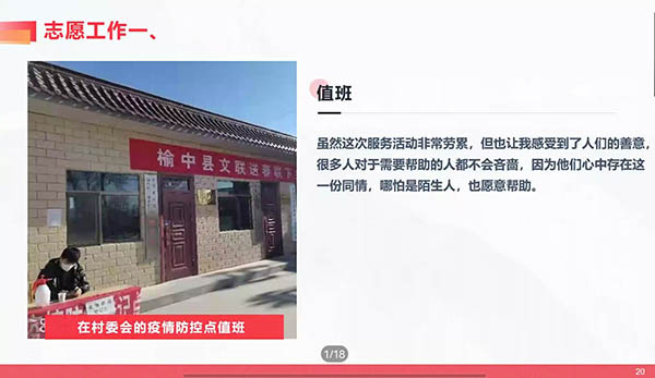 本次总结会议以“寒假社会实践”为主线。工美1903班黄艺杰、数媒2001班李丹等13位志愿者以PPT为媒介进行展示汇报。此次实践活动内容广泛,涵盖社会调查类、科技创新类、志愿活动类三大板块。实践选题新颖,内容丰富多样。有志愿者走访党员之家听老人们诉说曾经的故事,在与老党员交谈中了解他们的工作原则、生活作风;有艺术学子学以致用,在寒假期间发挥自己专业特长参与实践工作;还有学子在疫情期间“化身”志愿者投入乡村疫情防控工作,为家乡防疫抗疫奉献出属于自己的力量。会议最后,邓寒松进行总结评价,他在肯定同学们的同时,也对同学们提出希冀:“希望同学们能够知行合一,投身社会,积极参与志愿活动,为祖国今后的建设添砖加瓦”。至此,本次会议画上圆满句号。
