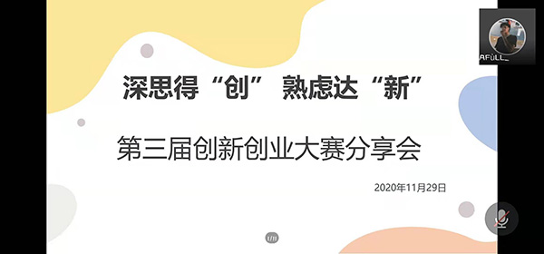 11月29日晚,设计艺术学院于腾讯会议成功开展了深思得“创”熟虑达“新”创新创业分享会。此次会议由产品1702班唐腾、2020级视传研究生朱杰主讲。2020级新生共54人参与分享会。本次会议由创新创业部组织开展学生干部胡川进行主持。
