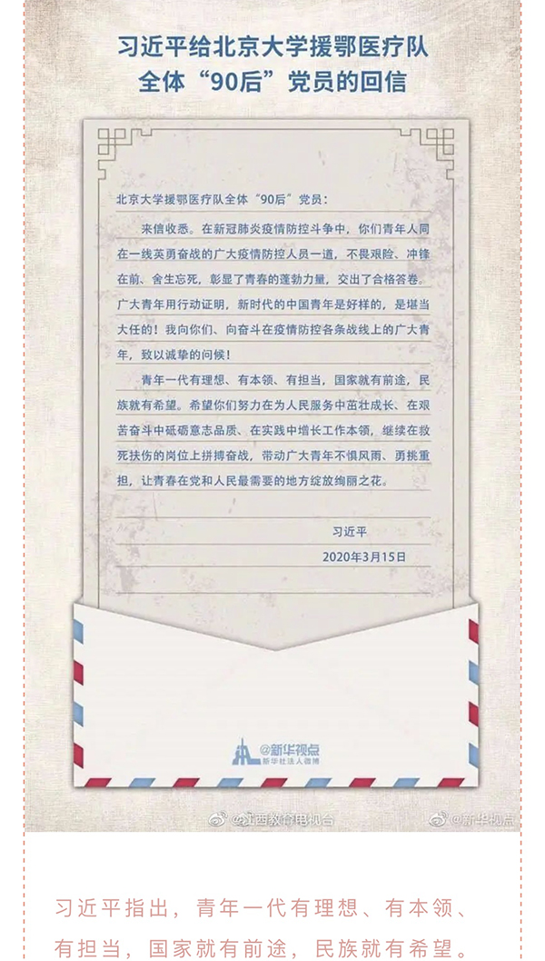 近日,习近平总书记给北京大学援颚医疗队全体“90”后党员回信,向他们和奋斗在疫情防控各条战线上的广大青年致以诚挚的问候。艺术学子对此感受颇深,愿将心中的情感通过纸笔抒发出来。在阅读中国青年参加抗疫的相关推送和文章后,纷纷拿起纸笔写下自己的感悟,每一份手写感悟,字里行间流露出艺术学子的真情实感。更是有许多学生成员自发进行抗击疫情的志愿活动,带起红袖章,化身抗疫前线的战士,守卫自己社区的那一份平安。每一篇感悟的字里行间,每一张照片都撼动着人们的心灵。