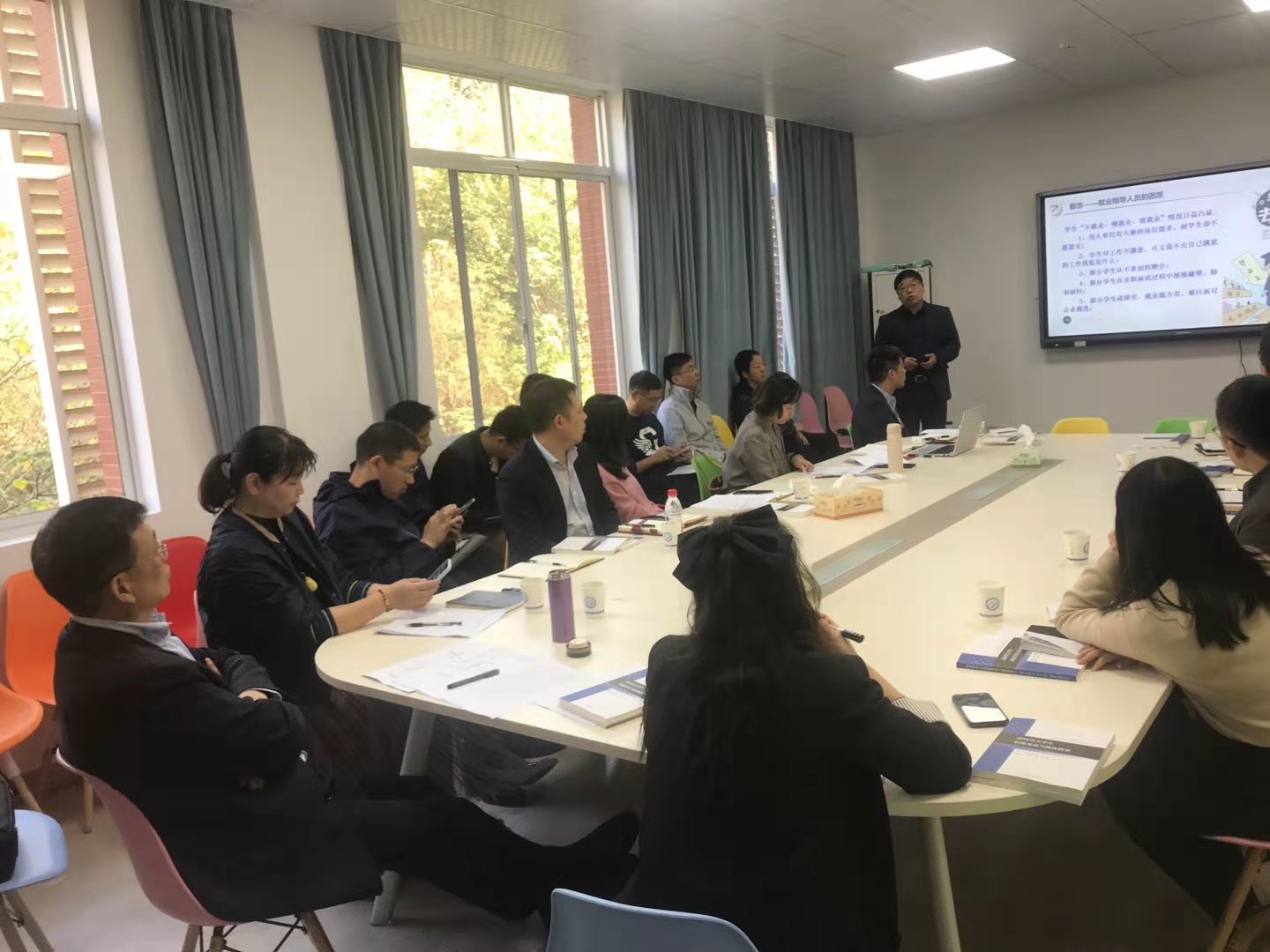 会上,团队负责人招就处处长曹瑛对大学生职业发展教育研究中心建设讨论方案进行解读,大学生职业发展教育研究中心建设将以培养大学生家国情怀,提升大学生职业素养与就业核心竞争力,帮助大学生实现充分高质量就业为目标,在三全育人教育理念下从模块建设、师资建设、课程建设三个方面充分发挥生涯教育在思政育人中的重要作用。
