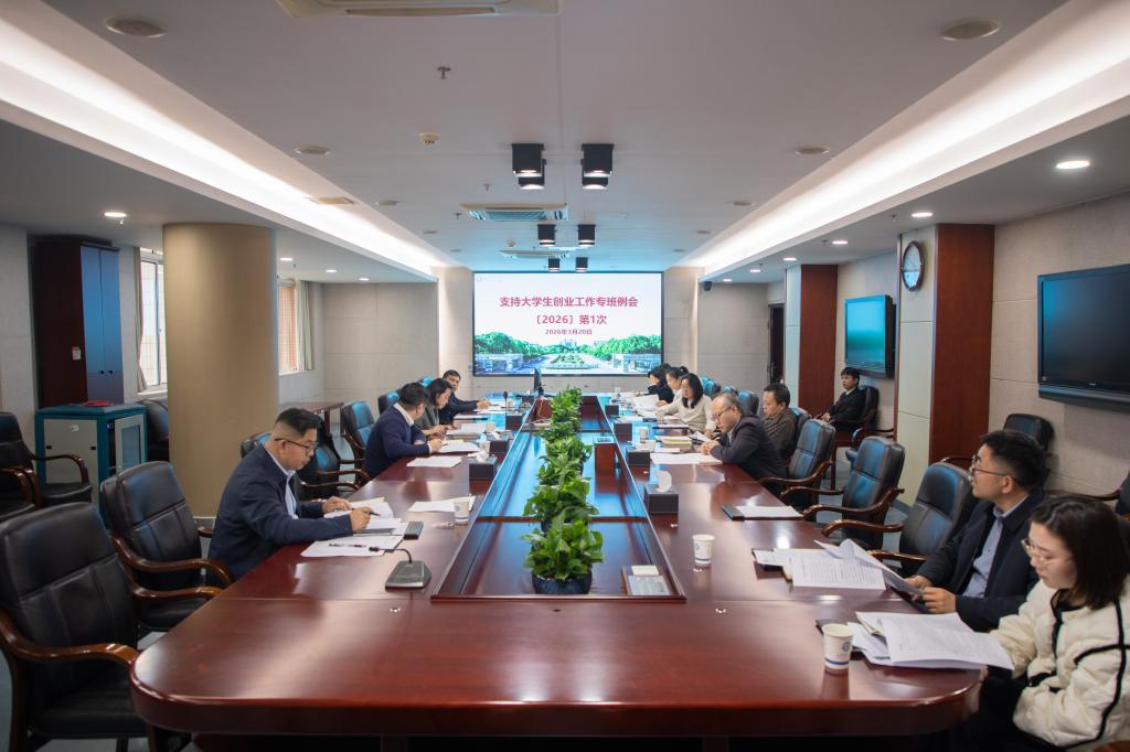 会上,通报了《支持大学生创业2026年工作要点》。宣传部常务副部长邱国良传达了全省大学生创业品牌宣传工作推进会会议精神。会议指出,2026年是支持大学生创业工作深化拓展之年,要锚定“打造全国乃至全球大学生创业目的地”的战略目标,纵深推进“七个一”战略举措,持续优化政策保障、资源赋能、服务供给和环境支持。创业就业指导处处长田上汇报了2025年支持大学生创业工作的落实情况及当前存在的困难问题,对照《2026年支持大学生创业工作提示》,解读了学校2026年重点工作任务及工作分工。创业专班成员单位负责人围绕“政策保障、课程建设、导师队伍建设、孵化基地提质、创业竞赛、创业文化”等工作的推进情况逐条进行汇报交流。会议明确,要重点突破教师单独评职称等难题,修订完善学分认定、转专业、评优评奖等实施细则,调动师生投身创业的积极性。