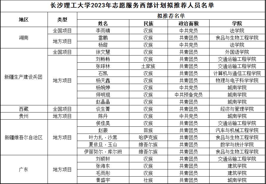 根据全国项目办印发《2023-2024年度大学生志愿服务西部计划实施方案》、省项目办印发《2023—2024年度湖南省大学生志愿服务西部计划实施方案》通知要求,学校项目办认真组织开展2023年西部计划志愿者招募选拔工作。根据省项目办下达的岗位指标,经过个人报名、资格审查、笔试、面试、体检、心理测试等环节,拟推荐22名学生参加西部计划,现将名单进行公示,详细名单如下。